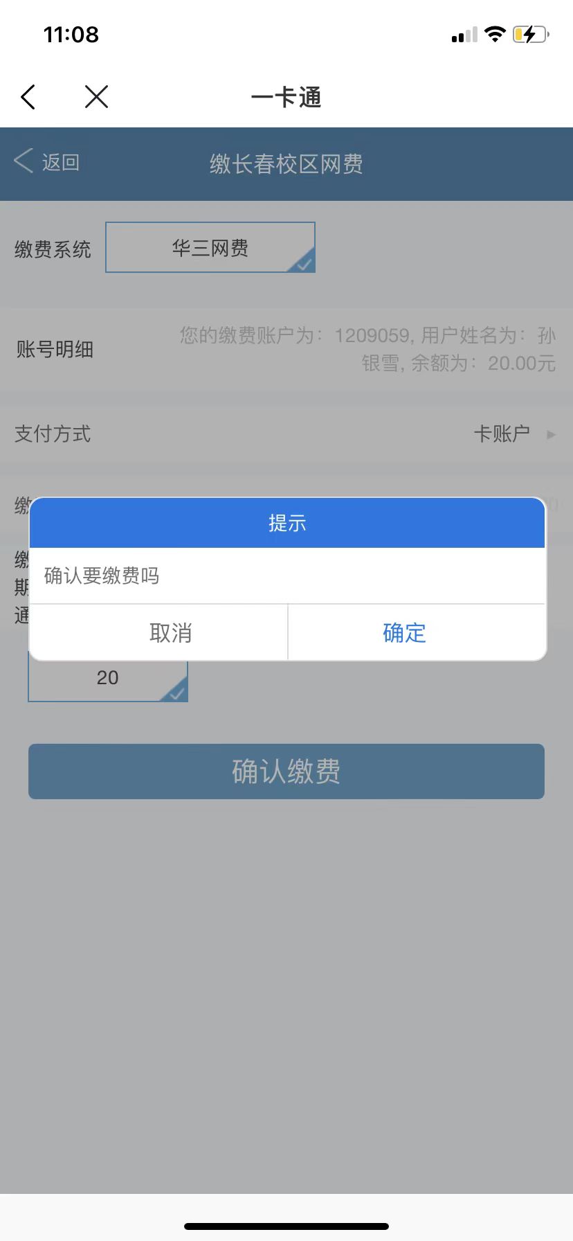3.由于校园网付费方式是从校园卡账户扣费,因此请提前给校园卡充值足够金额。选择支付方式卡账户,按自然月收费,每月20元,每个自然月第一次使用网络即扣除20元。点击确认缴费。