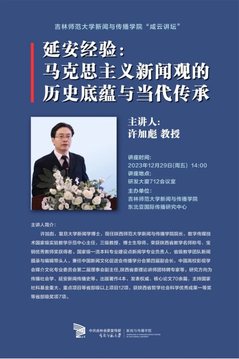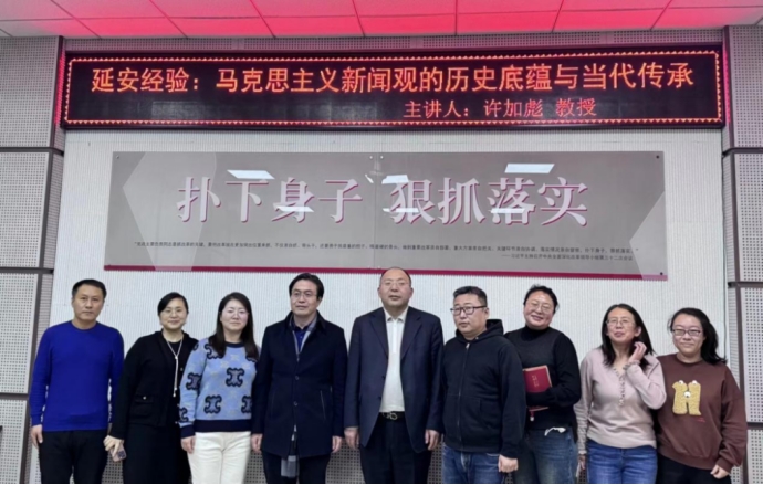 12月29日,bat365平台官网新闻与传播学院邀请陕西师范大学新闻与传播学院院长许加彪教授来院做讲座,主题为“延安经验:马克思主义新闻观的历史底蕴与当代传承”。夏维波院长、田静副院长、现代传媒研究中心王鹏主任等多位领导、教师以及全体在校研究生参会。