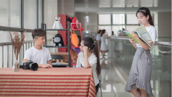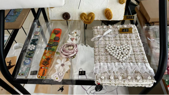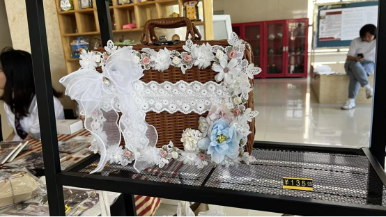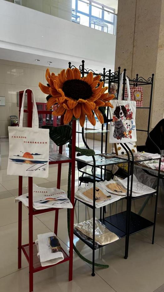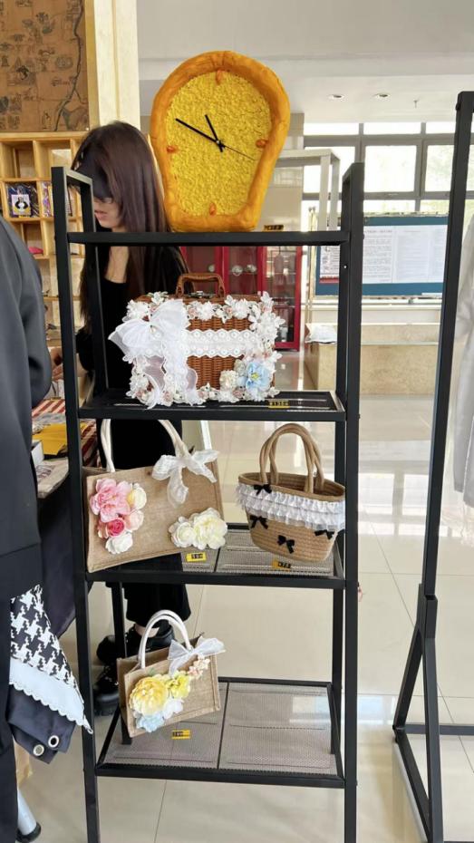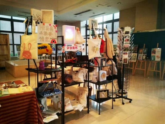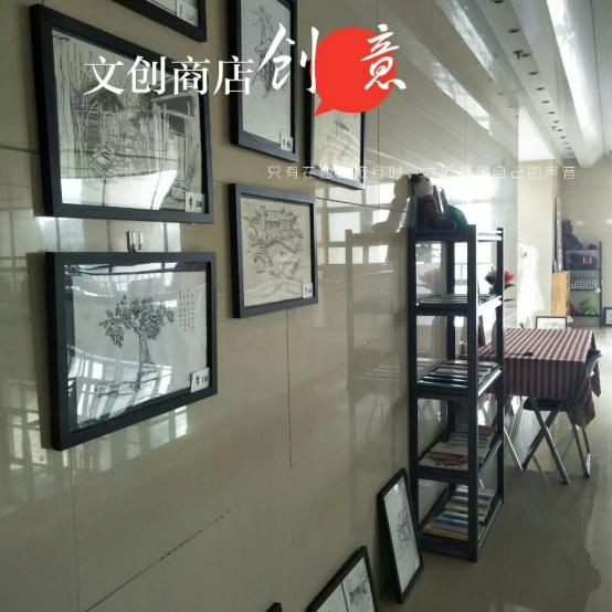 文创环廊利用教学楼二楼大厅,设置了丰富的展销架台(衣架、饰品架、明信片卡架、工艺品展示柜等)。由自由选购区、商品展示区、休息区、学生作品展示区四大区域组成。