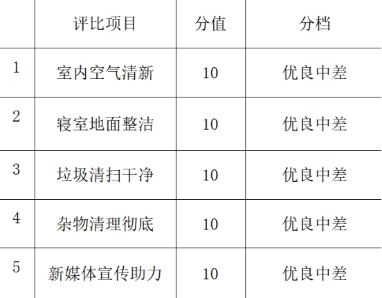室内空气清新,寝室地面整洁,垃圾清扫干净,杂物清理彻底,新媒体宣传助力。