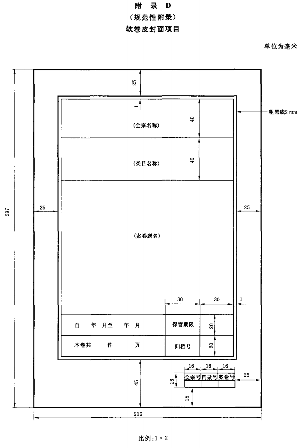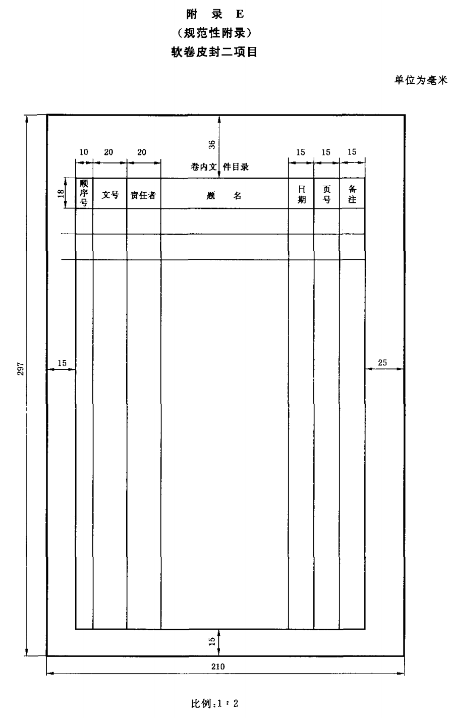 软卷皮封二项目包括:顺序号、文号、责任者、题名、日期、页号、备注。各项目具体位置、尺寸见附录E。