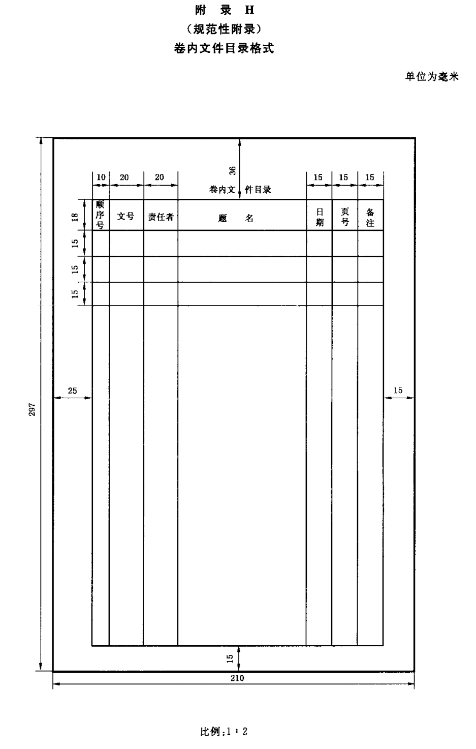 卷内目录用纸右白边(翻口)宽(15±0.5mm)(见附录H)