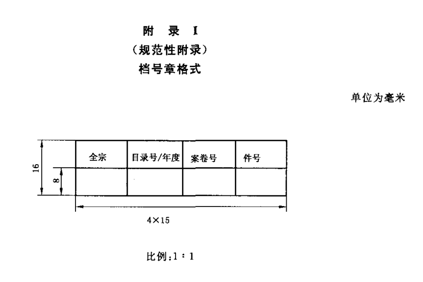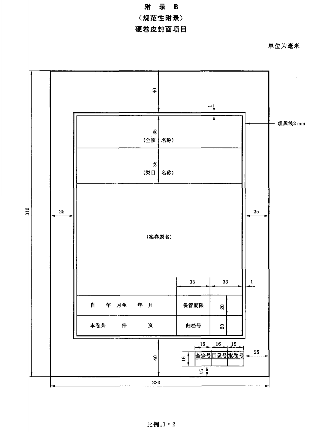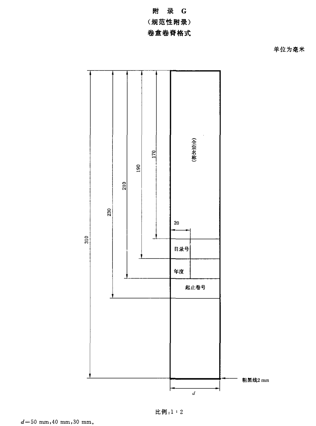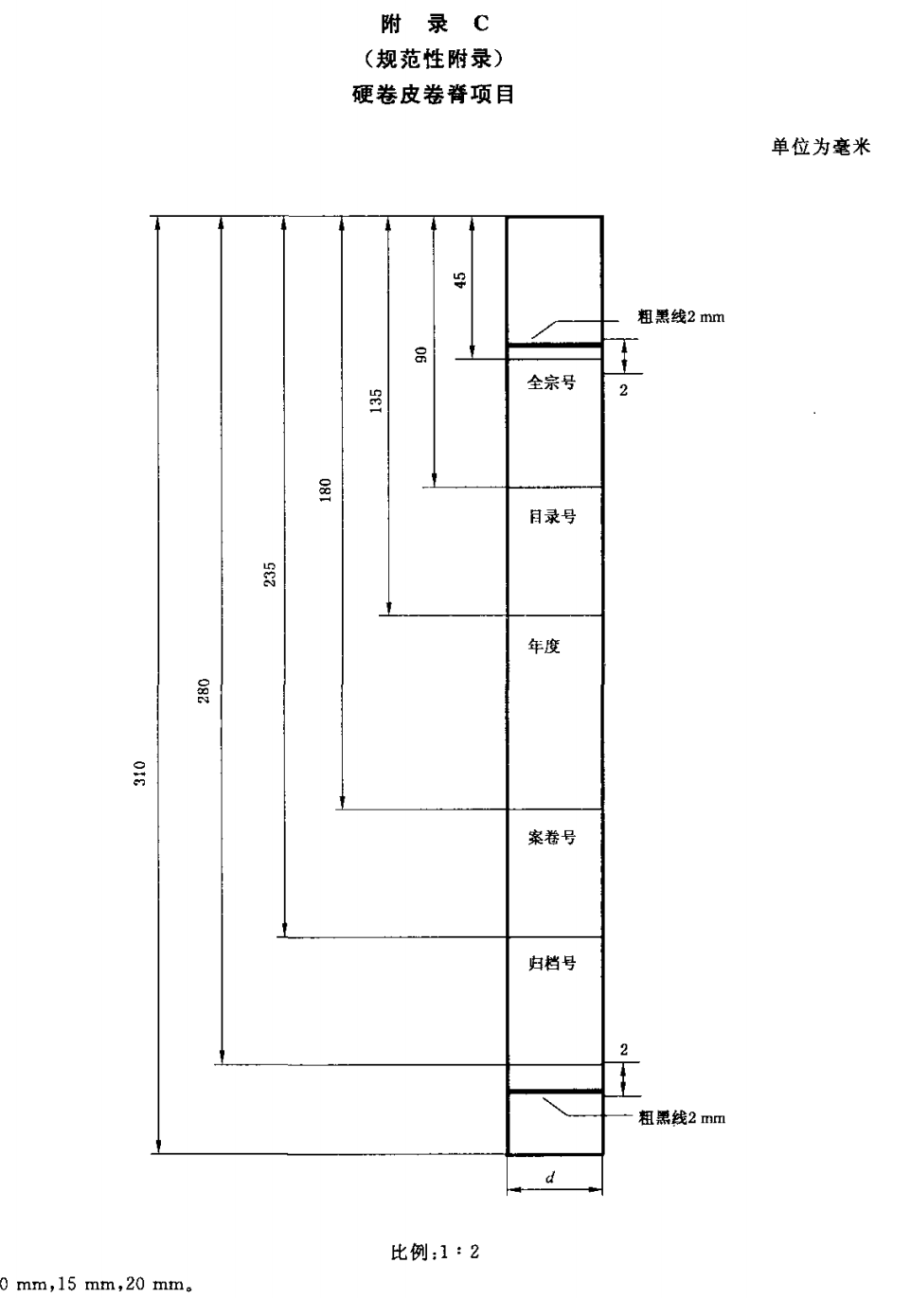 卷脊项目包括:全宗号、目录号、年度、案卷号、归档号,其排列格式尺寸见附录C。