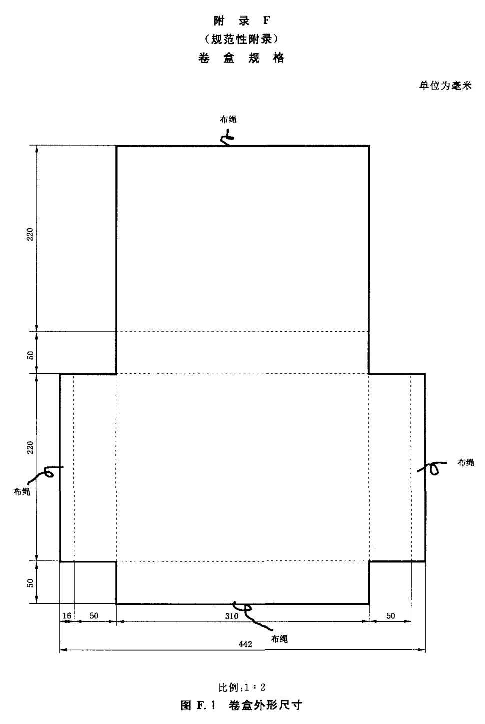 采用310mm×220mm(长×宽),其厚度可根据需要分别设置30mm、40mm或50mm的规格。在盒盖翻口处中部要设置绳带,使盒盖能紧扣住卷盒(见附录F 图F.1、图F.2、图F.3)。