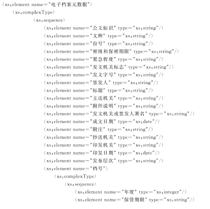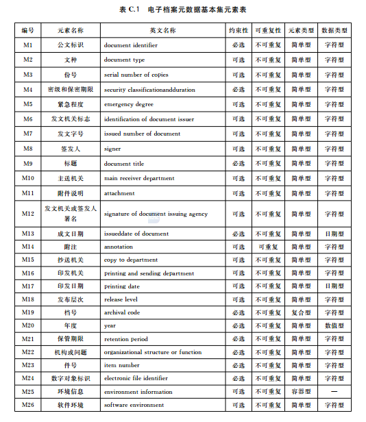 本章规定了描述电子档案的最基本的元数据集合,即元数据基本集。实际工作中可根据具体情况参照DA/T 46—2009及相关规范扩充元数据集合。