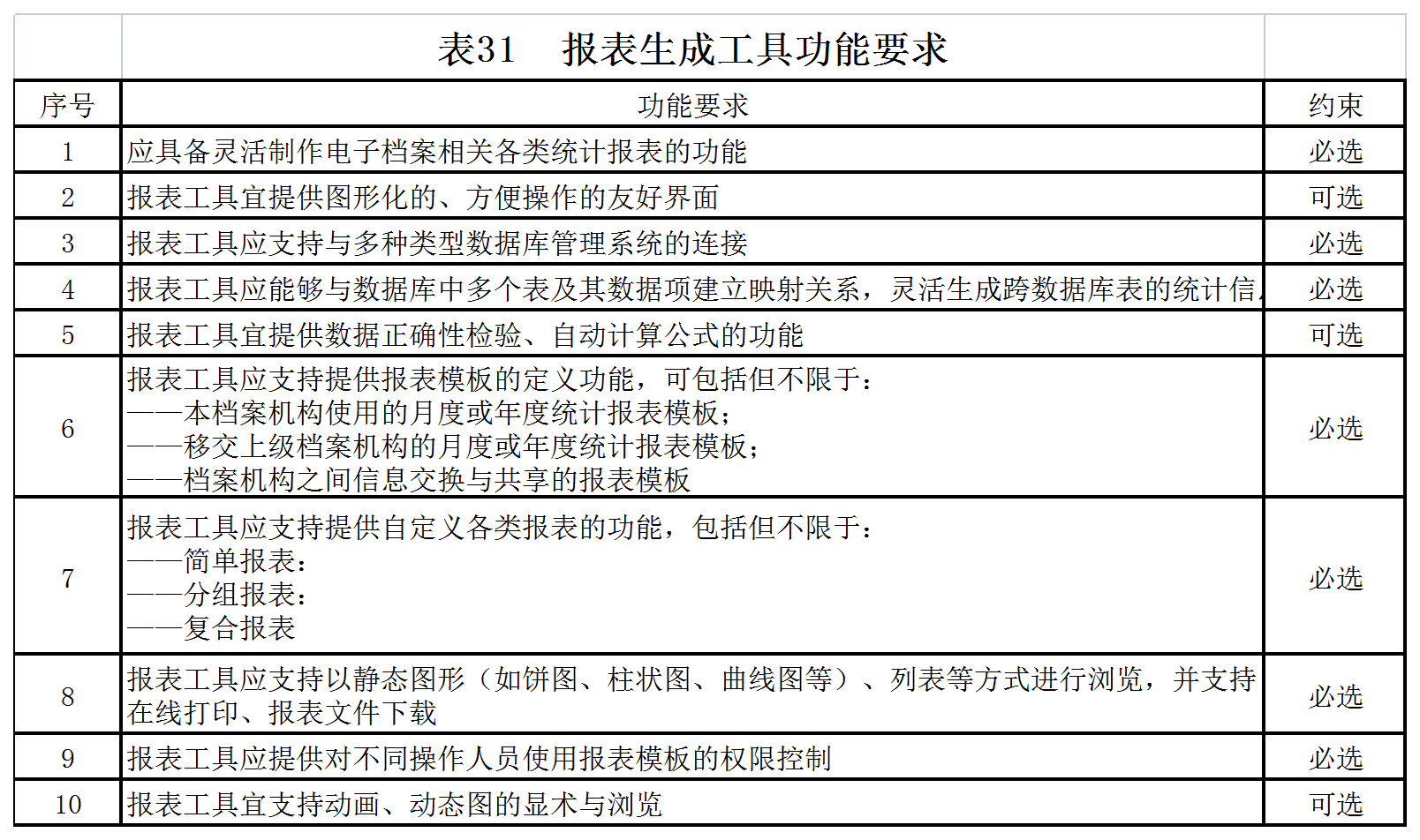 系统应提供报表制作工具,支持用户自定义统计报表。表 31 给出具体要求。