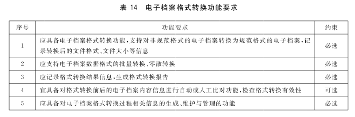 系统应具备将电子档案转换为符合国家长期保存和利用要求格式的功能。表 14 给出具体要求。