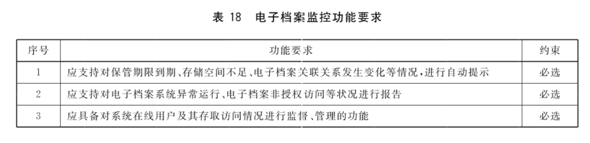 系统应具备对电子档案存储状况的监控与警告功能,对存储介质不稳定、存储空间不足、电子档案非授权访问和系统响应超时等情况发出警告,跟踪和记录警告事项处理过程。表 18 给出具体要求。
