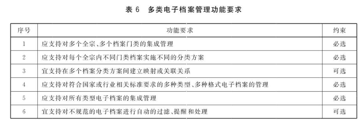 系统应能够管理符合国家、行业标准规定的多种门类、多种格式的电子档案。表 6 给出具体要求。