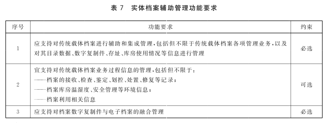 系统应具备对实体档案进行辅助管理的功能。表 7 给出具体要求。