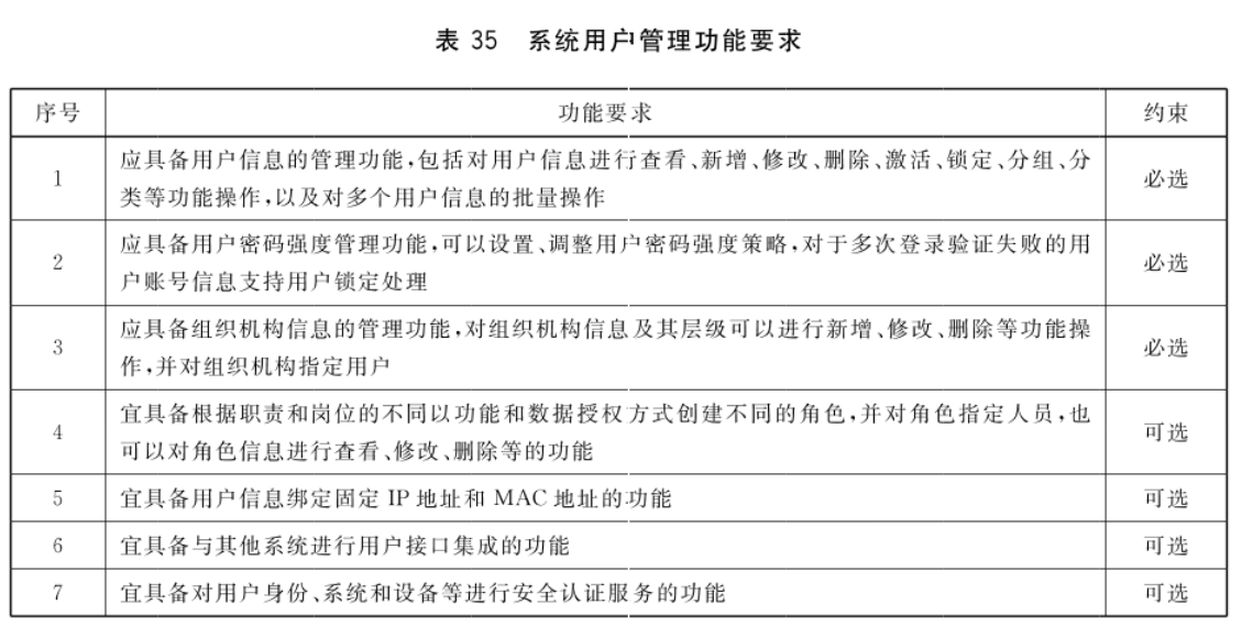 系统应具备对系统管理员,网络管理员,安全管理员、档案管理员和档案利用者等用户进行管理的功能。表 35 给出具体要求。