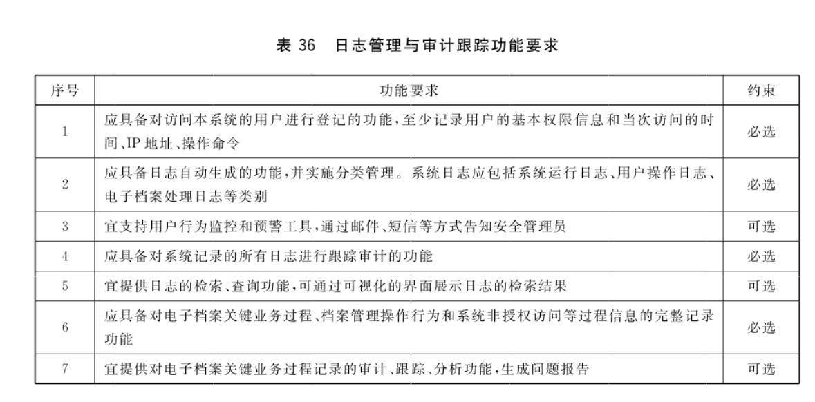 系统应具备对电子档案数据库操作日志及其分类管理功能,记录用户访问、存取和使用电子档案的行为和信息。系统应具备对电子档案关键业务过程、档案管理操作行为和系统非授权访问等事项进行审计、跟踪的功能。表 36 给出具体要求。