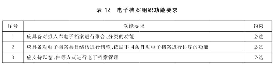 系统应具备电子档案的聚合、分类与排序等功能,支持分类与排序的调整。表 12 给出具体要求。