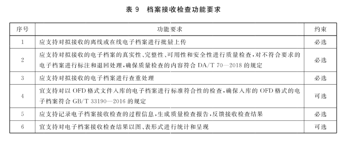 系统应具备对拟接收电子档案的数量、质量和规范性等进行检查的功能,对不合格的进行标注。表 9 给出具体要求。