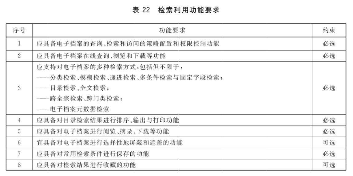 系统应具备对电子档案进行多条件的模糊检索、准确检索、全文检索和递进检索等功能,支持跨全宗、跨门类检索,检索结果能够进行局部浏览和选择性输出。表 22 给出具体要求。