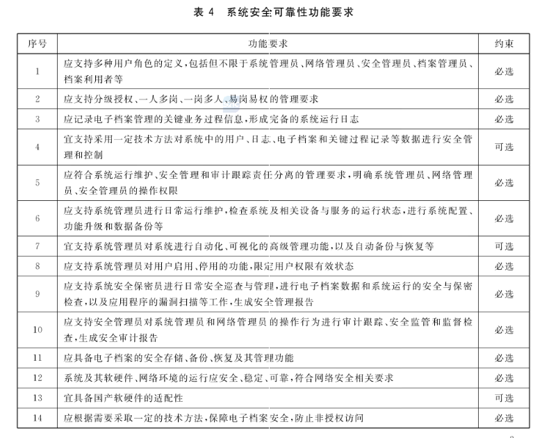 系统运行应安全可靠,宜根据需要采取一定的技术方法,防止非授权访问,保存电子档案管理关键业务过程记录,保障电子档案安全。表 4 给出具体要求。