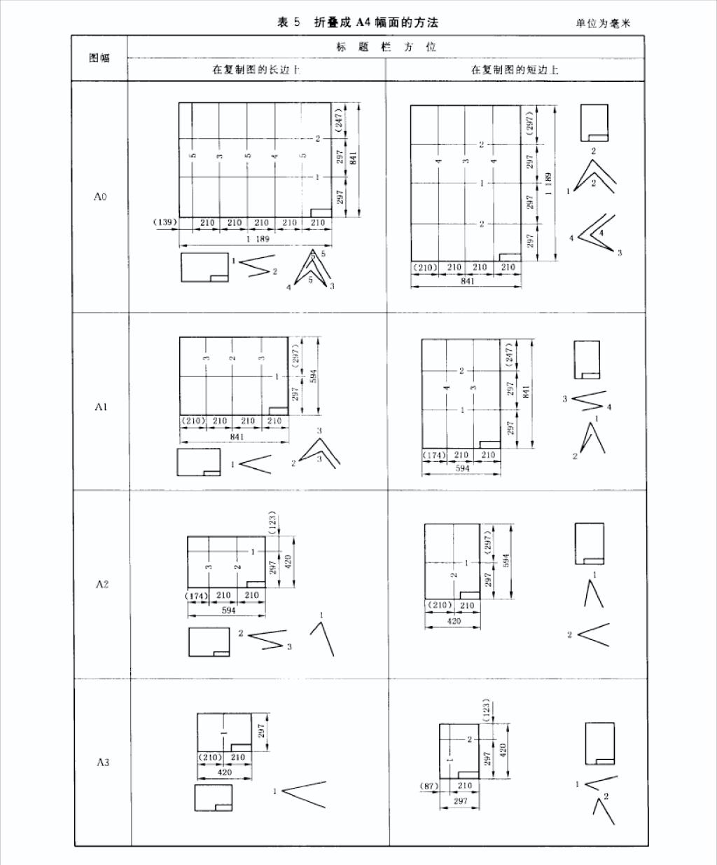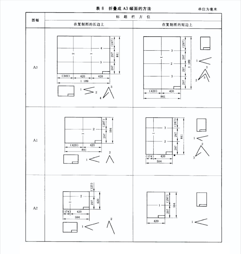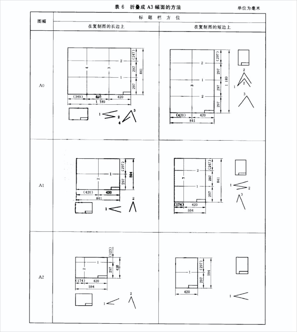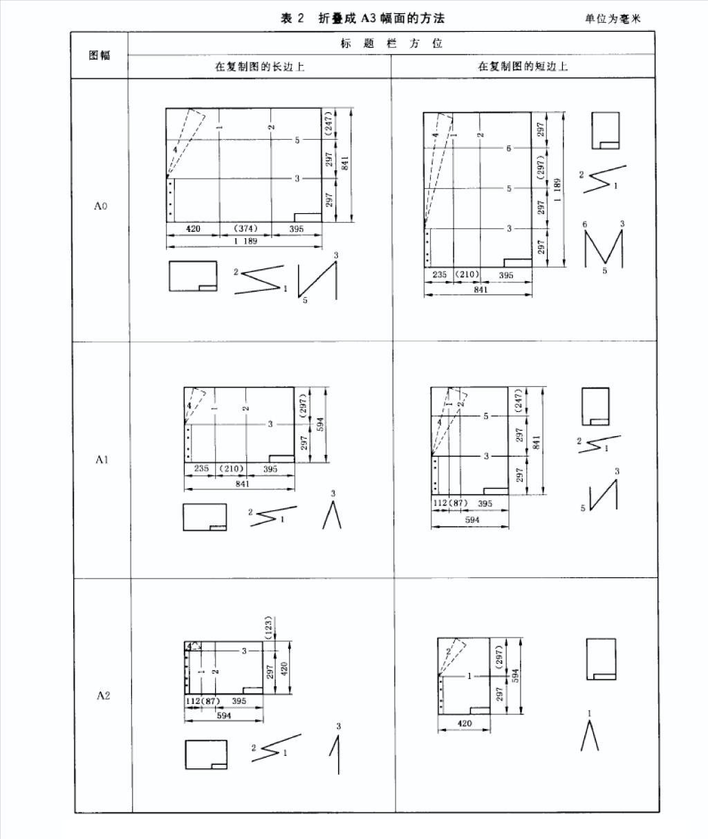 首先沿标题栏的长边方向折叠,然后再沿标题栏的短边方向折叠成A4或A3的规格,使标题栏露在外面,如表5和表6所示。