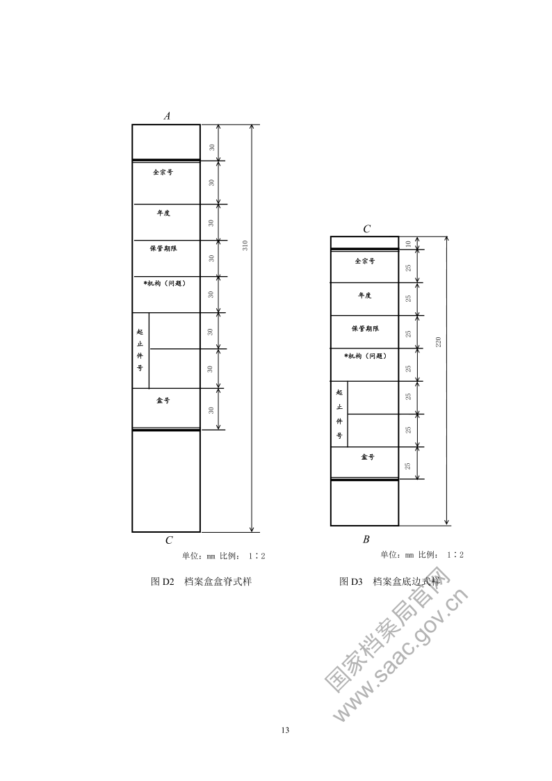 6.4.1.2 档案盒应根据摆放方式的不同,在盒脊或底边设置全宗号、年度、保管期限、起止件号、盒号等必备项,并可设置机构(问题)等选择项(见附录 D 图 D2、图 D3)。其中,起止件号填写盒内第一件文件和最后一件文件的件号,起件号填写在上格,止件号填写在下格;盒号即档案盒的排列顺序号,按进馆要求在档案盒盒脊或底边编制。