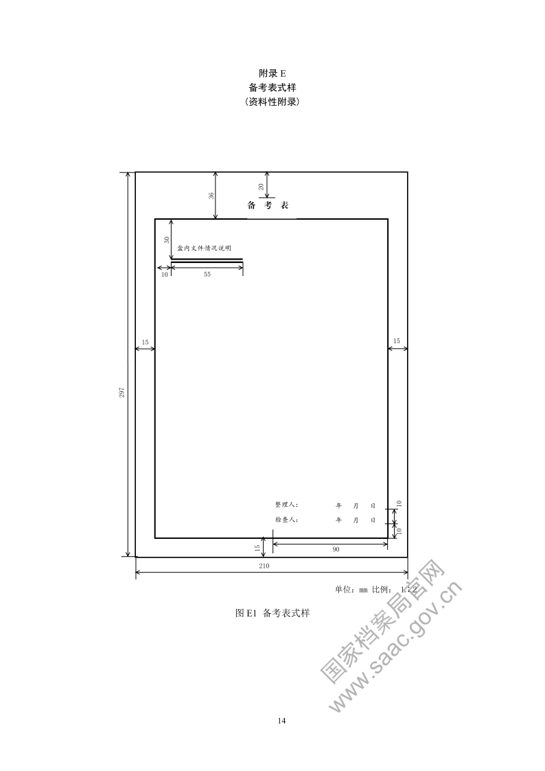 备考表置于盒内文件之后,项目包括盒内文件情况说明、整理人、整理日期、检查人、检查日期(见附录 E)。