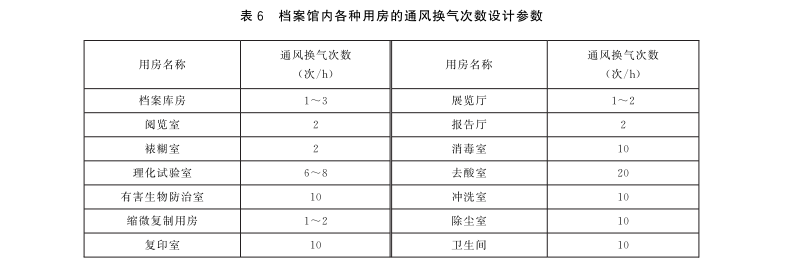 5.2.3 档案馆内各种用房的通风换气次数设计参数应符合表6的规定。