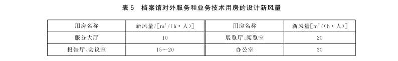5.2.2 档案馆对外服务和业务技术用房的设计新风量应符合表5的规定。
