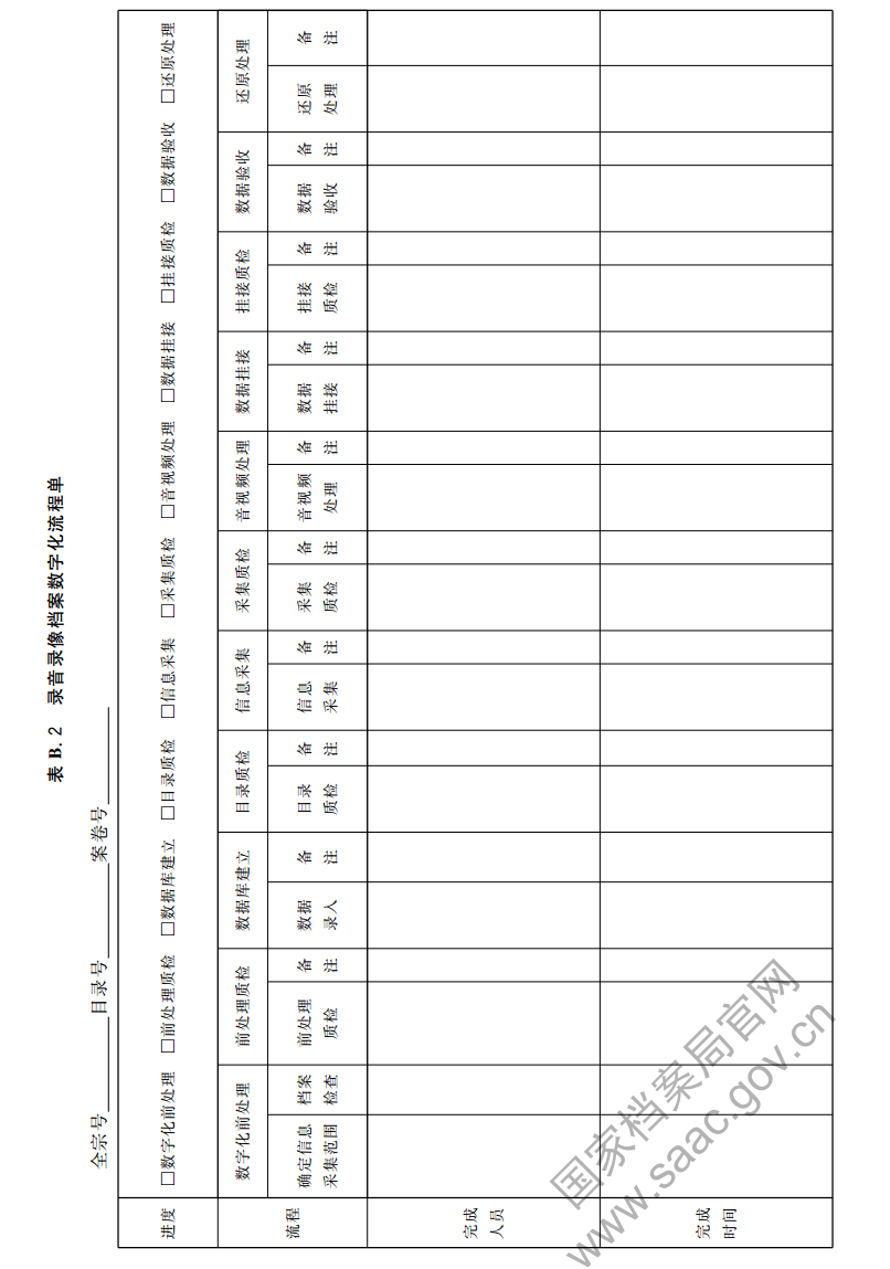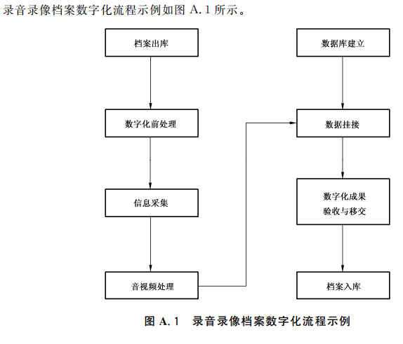5.5.1 应依照相关法律法规和各类技术标准,制定相关的工作流程和各环节操作规范等,对录音录像档案数字化全过程进行有效的控制,确保数字化成果质量。录音录像档案数字化流程示例参见附录 A。
