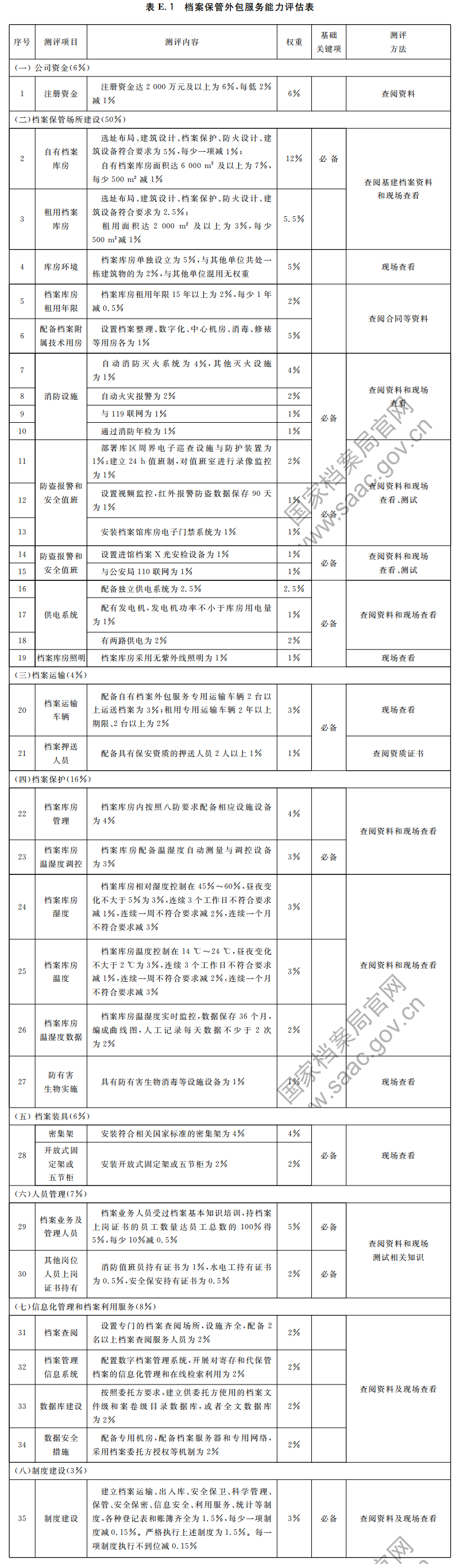 9.1 档案保管外包服务机构可通过档案保管外包服务行业组织开展能力评估。能力评估可参照附录 E。