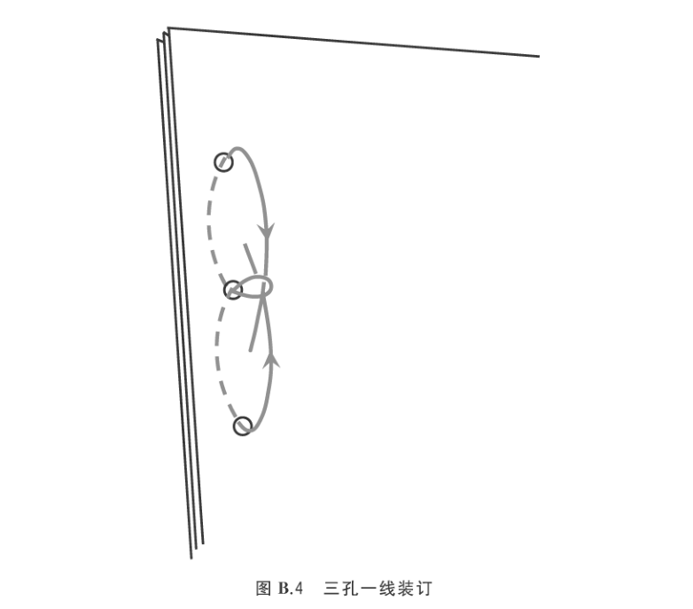 7.4.3 穿线时,先将装订绳对折,将两个绳头并齐后从文件背面穿入中间孔,再将绳头分别向下穿入两边的孔中,并从由装订绳形成的圈中交叉穿过。用力拉紧两个绳头,使装订绳紧缚文件,再将两个绳头在中件孔处打结(见图 B.4)。