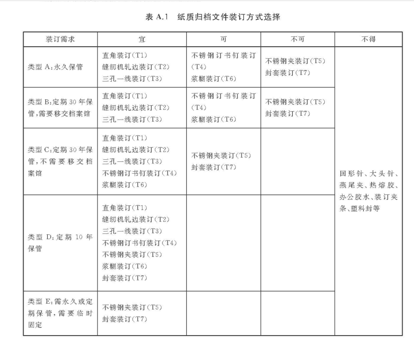 永久或定期保管,但尚未完成整理、数字化工作,需要临时固定的,宜采用不锈钢夹装订(T5)、封套装订(T7)(见附录A)。
