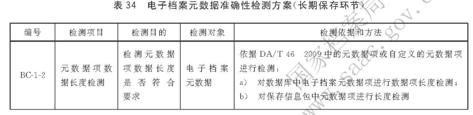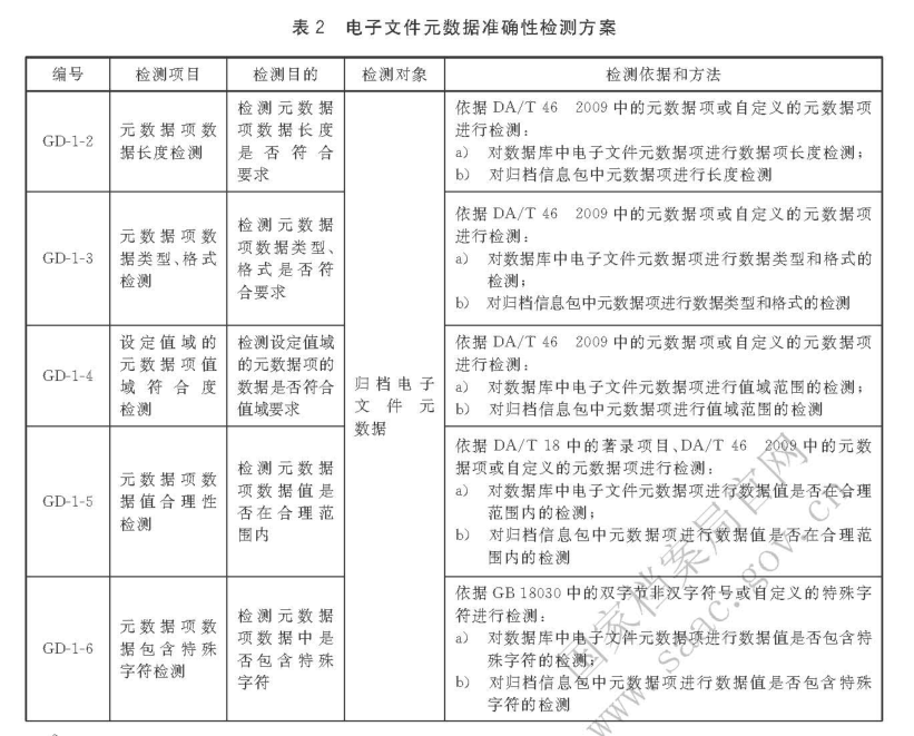 检测归档电子文件元数据是否符合DA/T 46一2009 等标准或自定义元数据方案要求,包括数据长度、类型、格式、值域以及元数据项赋值是否合理等。