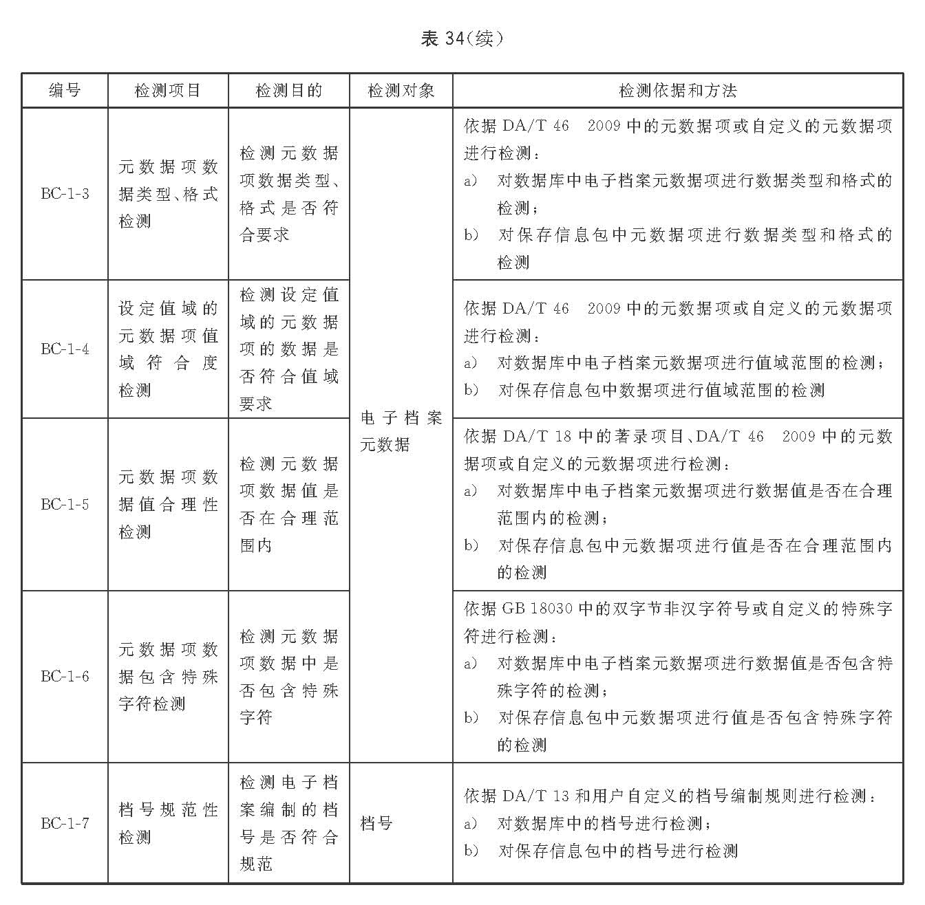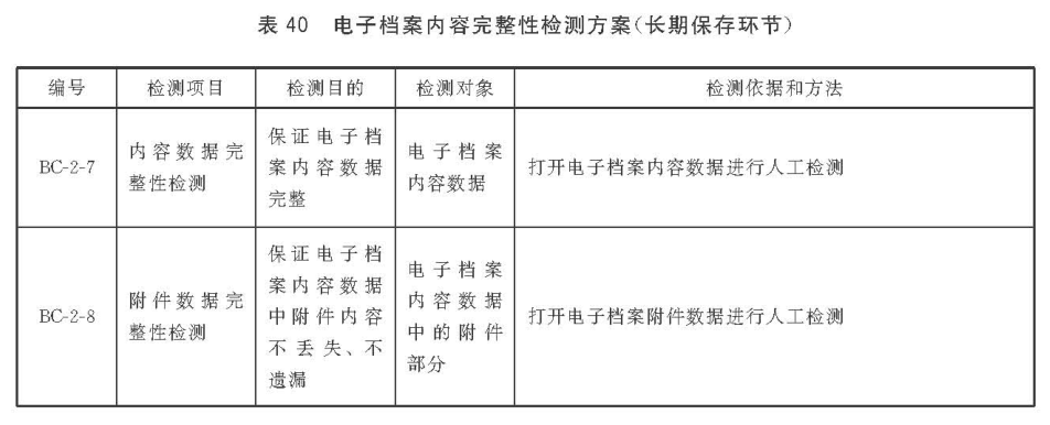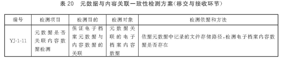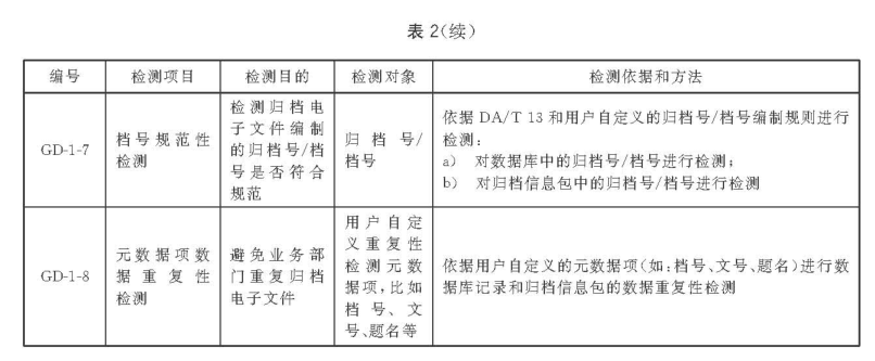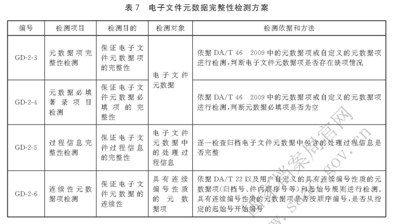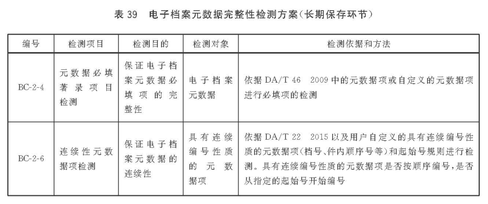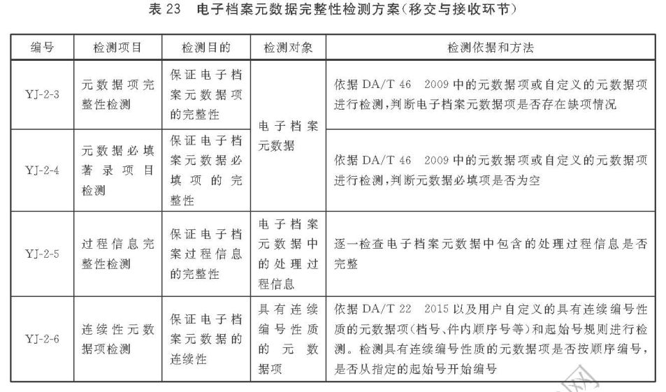 对照 DA/T 46一2009 或自定义元数据方案,检测元数据项是否齐全完整;反映重要问题的归档电子文件是否包括主要修改过程和办理情况记录;具有连续编号的元数据项(比如归档号、件内顺序号等)是否有漏号现象等。