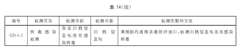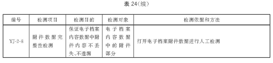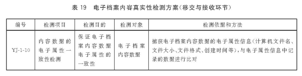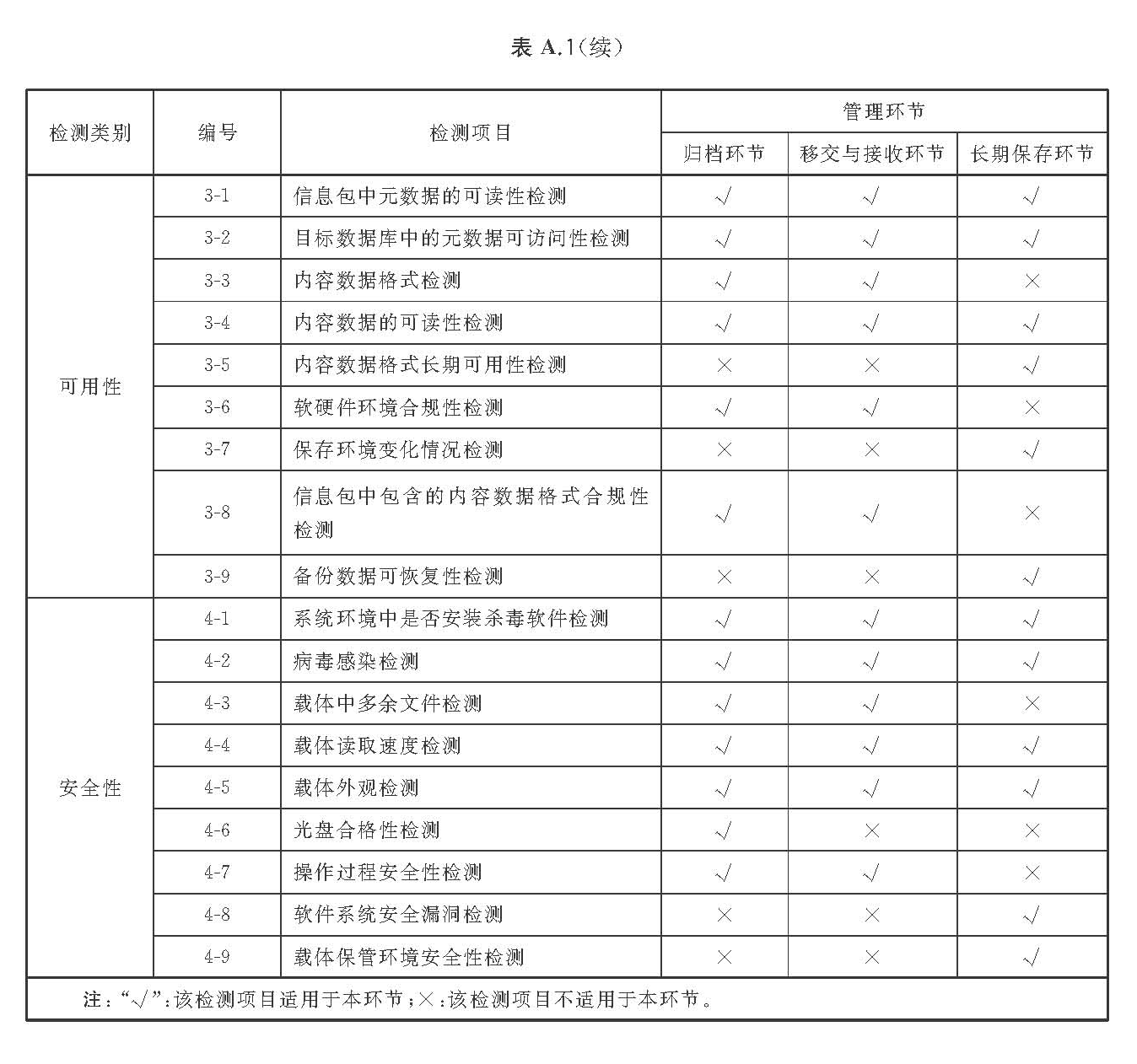 检测项目总计45项,包括真实性、完整性、可用性、安全性四个类别,其中真实性检测项目16项,完整性检测项目11项,可用性检测项目9项,安全性检测项目9项,覆盖电子文件归档环节电子档案移交与接收环节和电子档案长期保存环节。管理环节与检测项目的对照表参见附录A。