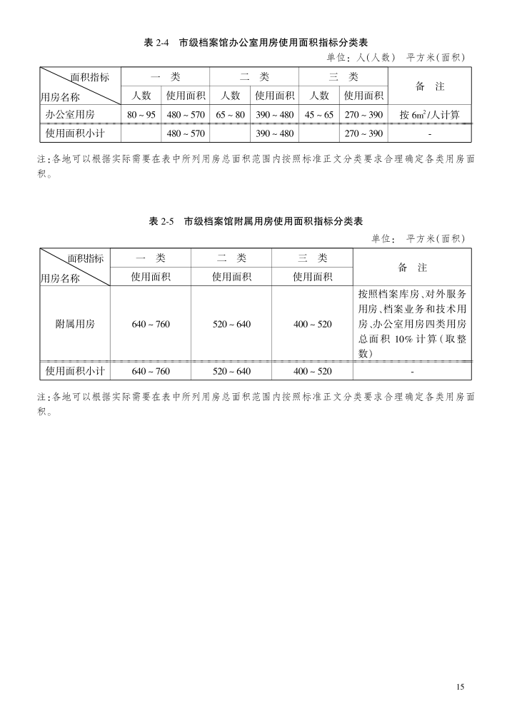 实际上,经过多年来的实践以及近年来大量的档案馆的改、扩建工程经验的总结,加之针对本标准进行的调研,一般认为省级档案库的面积以密集架、五节档案架各占50﹪推算的指标是比较贴近实际的,即:使用面积40㎡/万卷;市级档案库的面积以密集架、五节档案架各占20﹪、80﹪推算的指标是比较贴近实际的,即:使用面积 50㎡/万卷;由于县级财政一般无法承担县级档案馆建设密集架库房所带来的高额成本,以及购买密集架的成本,主要以五节档案架为标准设定相应指标,即:使用面积60㎡/万卷。