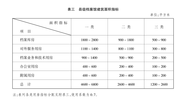 第二十三条 县级档案馆建筑面积指标应符合表三的规定。