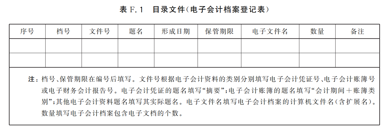 表 F.1 给出了电子会计档案保存时所用的目录文件(电子会计档案登记表)格式,图 F.1 给出了电子会计档案存储结构的示意图,图 F.2 给出了电子会计凭证存储结构的示意图。