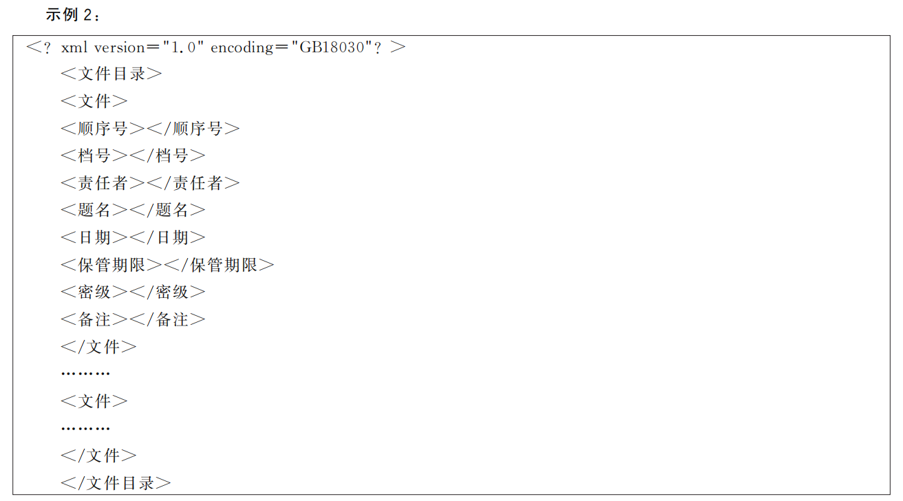 图 B.1 中,目录文件命名为“目录文件 .XML ”,存放有关档案的目录信息,目录文件与每份电子档案相对应,根据电子档案具体归档方式进行描述。以“件”的方式管理为例,目录文件 XML 信息格式见示例 2 (encoding 属性值可以是“GB18030”“GB2312”“UTF-8”)。