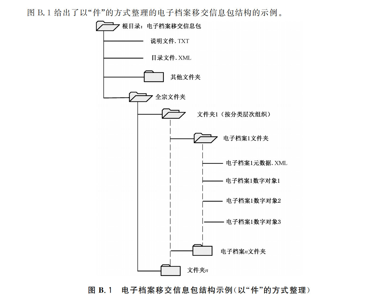 图 B.1 中的全宗文件夹下,按分类层次组织文件夹,电子档案文件夹以档号命名,存放电子档案内容数据及其元数据。