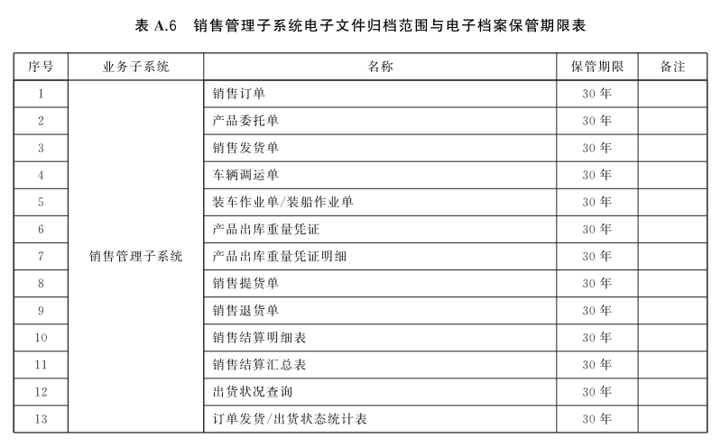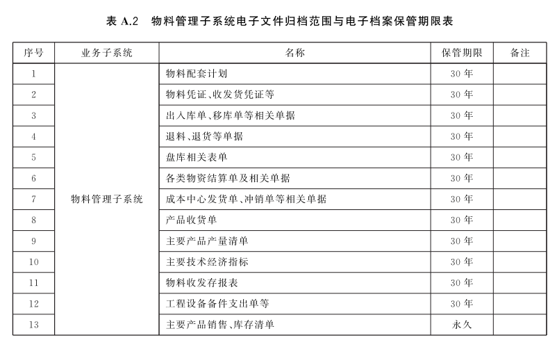 7.2.1 ERP系统电子文件归档时应划定保管期限,保管期限分为永久和定期,定期一般为30年和10年,具体见附录A。