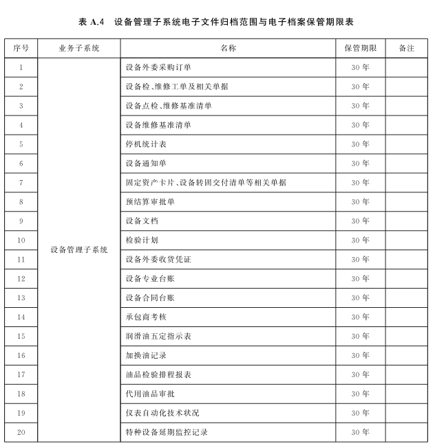 本附录列出ERP系统电子文件归档范围和电子档案保管期限表,表A.1是采购管理子系统电子文件归档范围与电子档案保管期限表,表A.2是物料管理子系统电子文件归档范围与电子档案保管期限表,表A.3是生产计划管理子系统电子文件归档范围与电子档案保管期限表,表A.4是设备管理子系统电子文件归档范围与电子档案保管期限表,表A.5是质量管理子系统电子文件归档范围与电子档案保管期限表,表A.6是销售管理子系统电子文件归档范围与电子档案保管期限表,A.7是项目管理子系统电子文件归档范围与电子档案保管期限表,A.8是主数据电子文件归档范围与电子档案保管期限表,供企业制定ERP系统电子文件归档范围与电子档案保管期限表时参考。