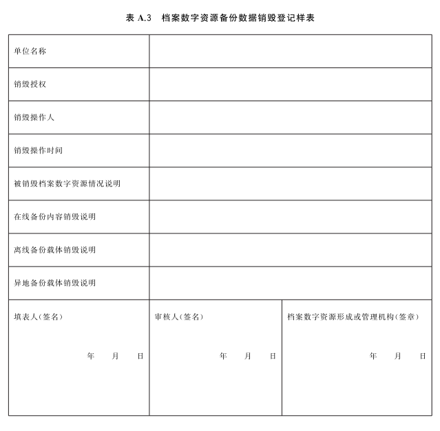在确认原备份载体数据的复制、更新和转换等活动成功后,宜根据相关规定对原离线备份载体实施破坏性销毁。销毁活动信息记录参考表 A.3。