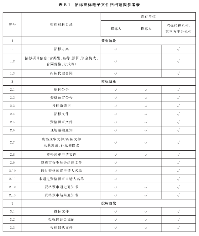 表 B.1给出了招标投标电子文件归档范围参考表。