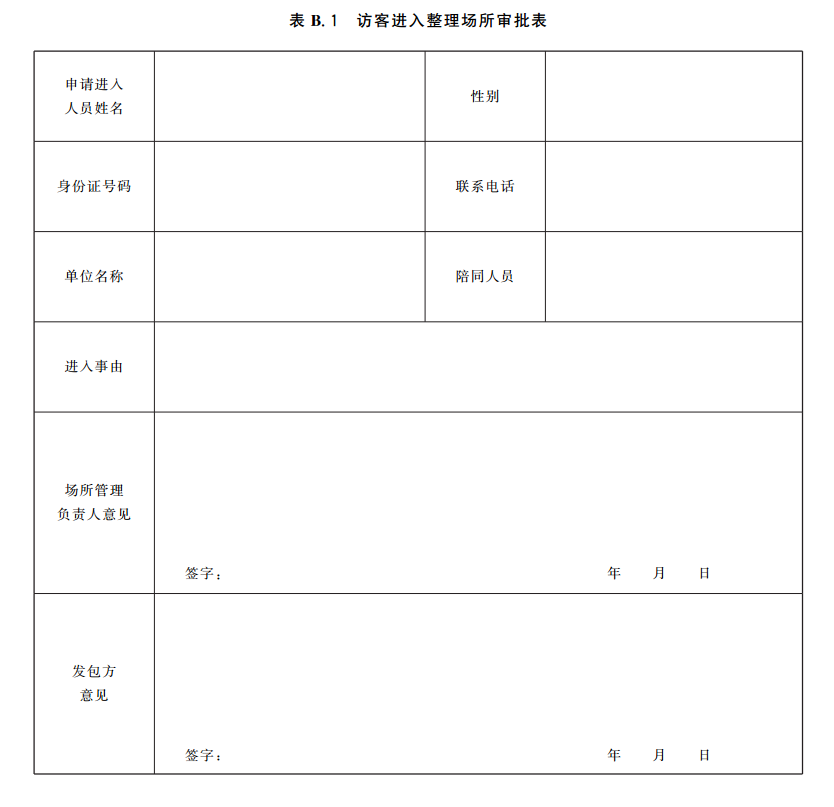 表 B.1 给出了访客进入整理场所审批表的样式。