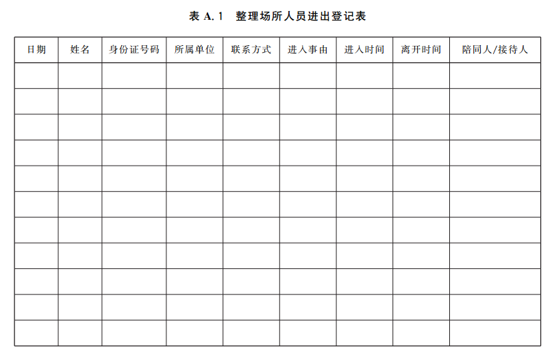 表 A.1 给出了整理场所人员进出登记表的样式。