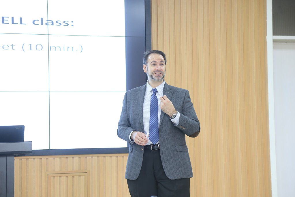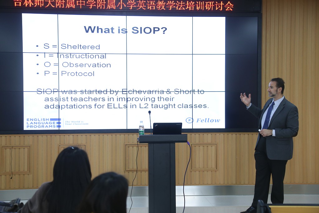 接着,Steven教授讲授了“SIOP教学模式”,为教师们提供了一套较完善的备课、授课模式。他指出,教师要用不同的策略给学生提供有意义、可理解的语言和内容,培养他们独立思考及自我规范的能力,评估和复习也是教师观察并与学生互动的方法。教师还可根据所获得的信息,调整授课方法、手段和速度,使整个教学形成一个良性循环,确保课堂教学的高质高效。