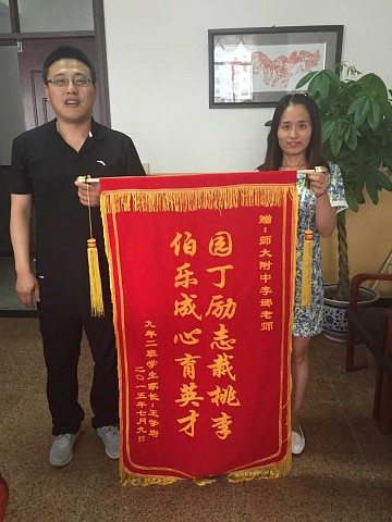 7月10日下午,bat365一名2015届毕业生家长满怀感激之情,将写有“园丁励志栽桃李,伯乐诚心育英才”字样的锦旗送到原九年二班班主任李娜老师的手中,以此感谢李娜老师对孩子无微不至的关心和照顾,盛赞学校培养出如此师德高尚的优秀教师。