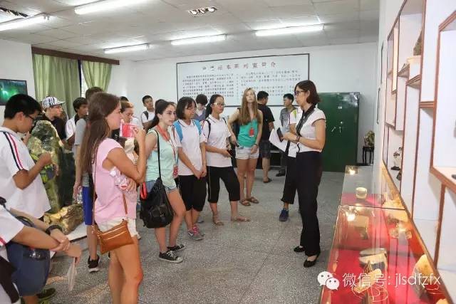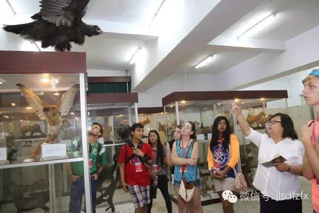 下午13:30时,45名美国师生与师大附中志愿者分三组分别参观了bat365平台官网历史文物馆、满族民俗馆、佟佳氏博物馆、福文化博物馆、生物标本室、地质标本室。在生物标本室营员们宛如走近一个真实的动物世界;地质标本室,向营员们展现了亿万年前曾在地球上繁衍生息过的古代生物化石标本及地质标本,一路走来每个营员的脸上都写着“Surprise”;在历史文物馆,910件古文物囊括了中国整个人类历史的典型文物,翔实地记载了中国发展史;之后同学们有序的参观了满族民俗馆、佟佳氏博物馆,馆里陈列着上百件具有满族民俗特色的服装、兵器、手工艺品,营员们知道了满族男人留发束辫穿马蹄袖袍褂、满族妇女缠脚裹足以及佟佳氏的姓氏由来、佟佳氏族如何助努尔哈赤崛起等知识;福文化博物馆展现的是祈福纳吉的摆件和饰品,营员们驻足在寓意福禄寿喜老寿星面前,明白了这是华夏人民对美好事物的向往,他们更加坚信中华民族是一个乐观、友善、热爱和平的国家。展馆中一件件物品都绽放出华夏人民智慧的光彩,不断激发出营员们进一步了解中国文化的兴趣。