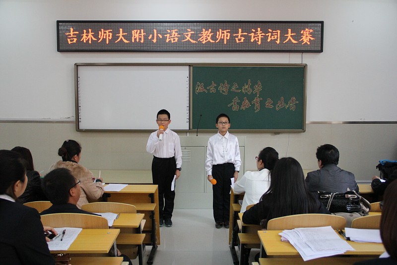 比赛内容是小学一至六年级语文书中的全部古诗词,比赛分两个环节:第一个环节是诵读部分,每位教师现场抽取两首古诗,并当场背诵;第二个环节是九组教师分别抽取两首古诗进行默写。教师们声情并茂、富有韵味的朗诵博得了在场观众的阵阵掌声。