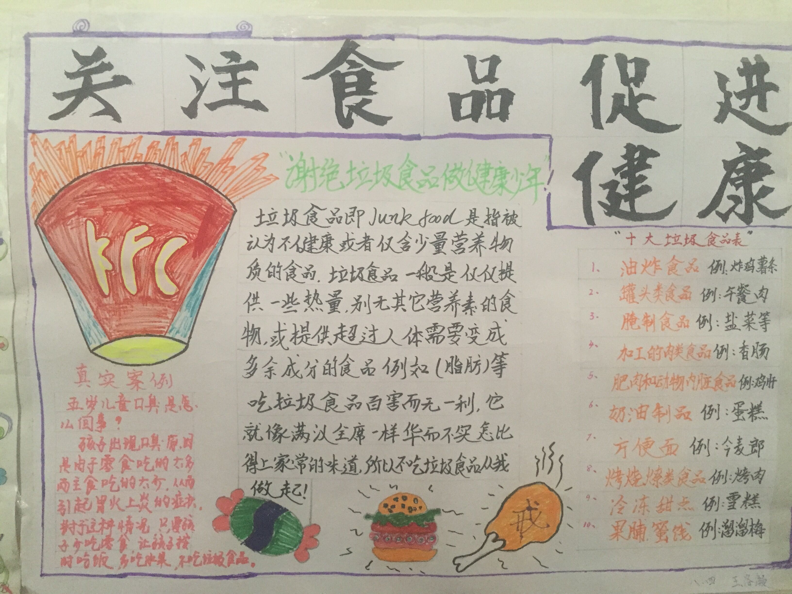 同学们通过查阅相关书籍、搜索网络资源等多种方式搜集食品安全常识及垃圾食品危害等手抄报素材,再通过自己的精心构思,设计出一幅幅内容丰富、插图精美的手抄报,号召学生养成良好的饮食习惯和健康的生活方式,倡议学生从自身做起、从身边小事做起,坚决杜绝垃圾食品。