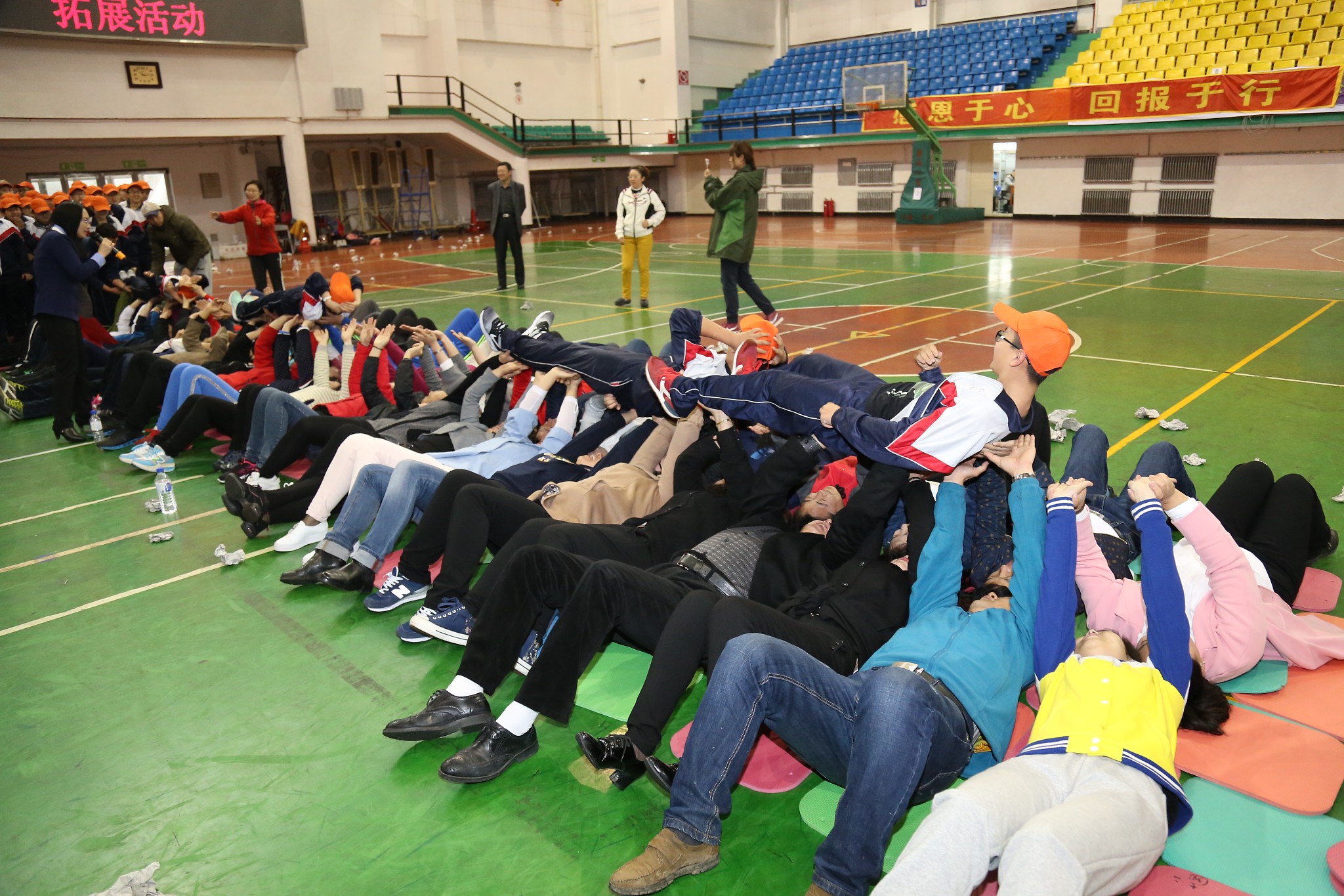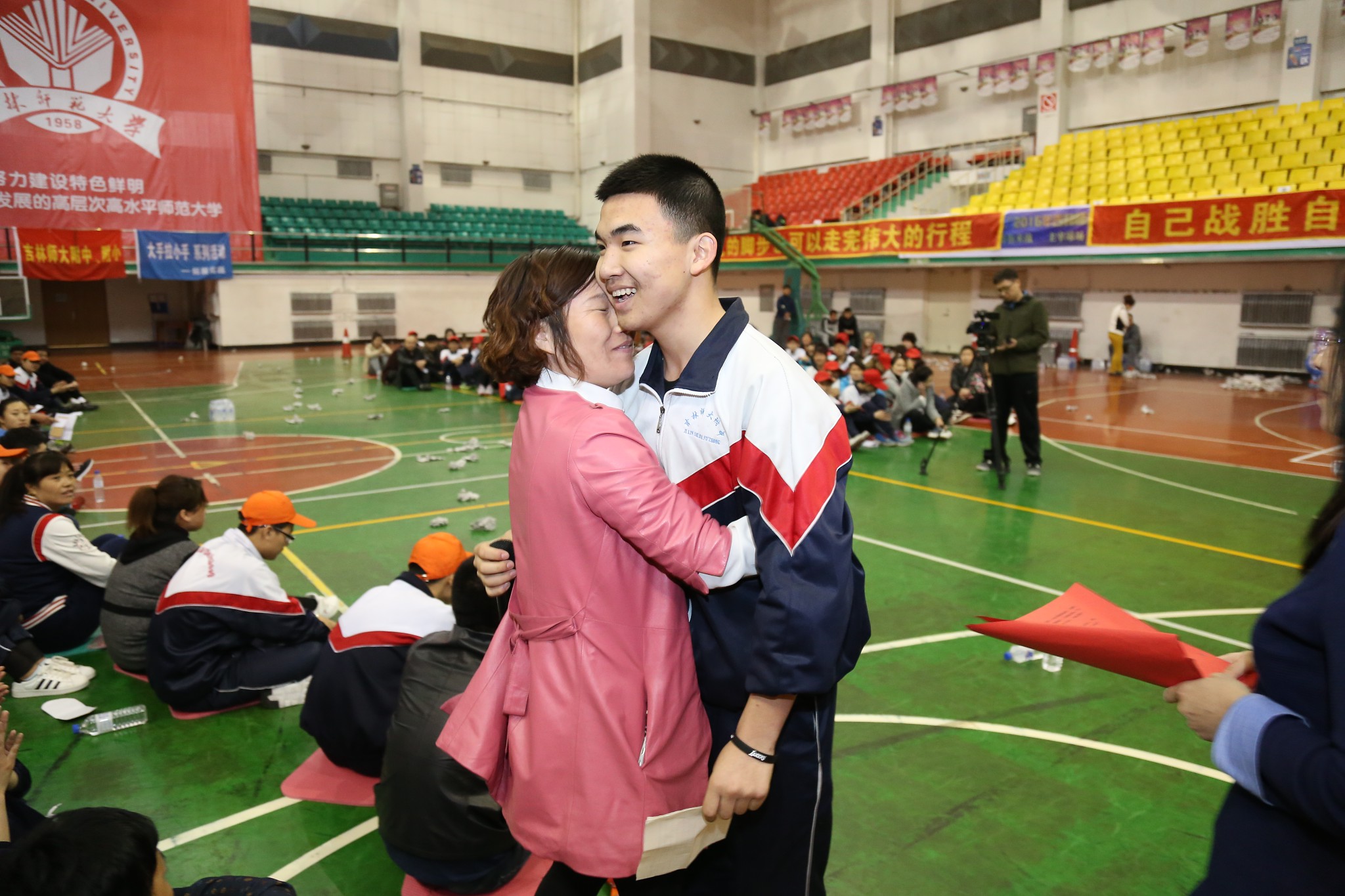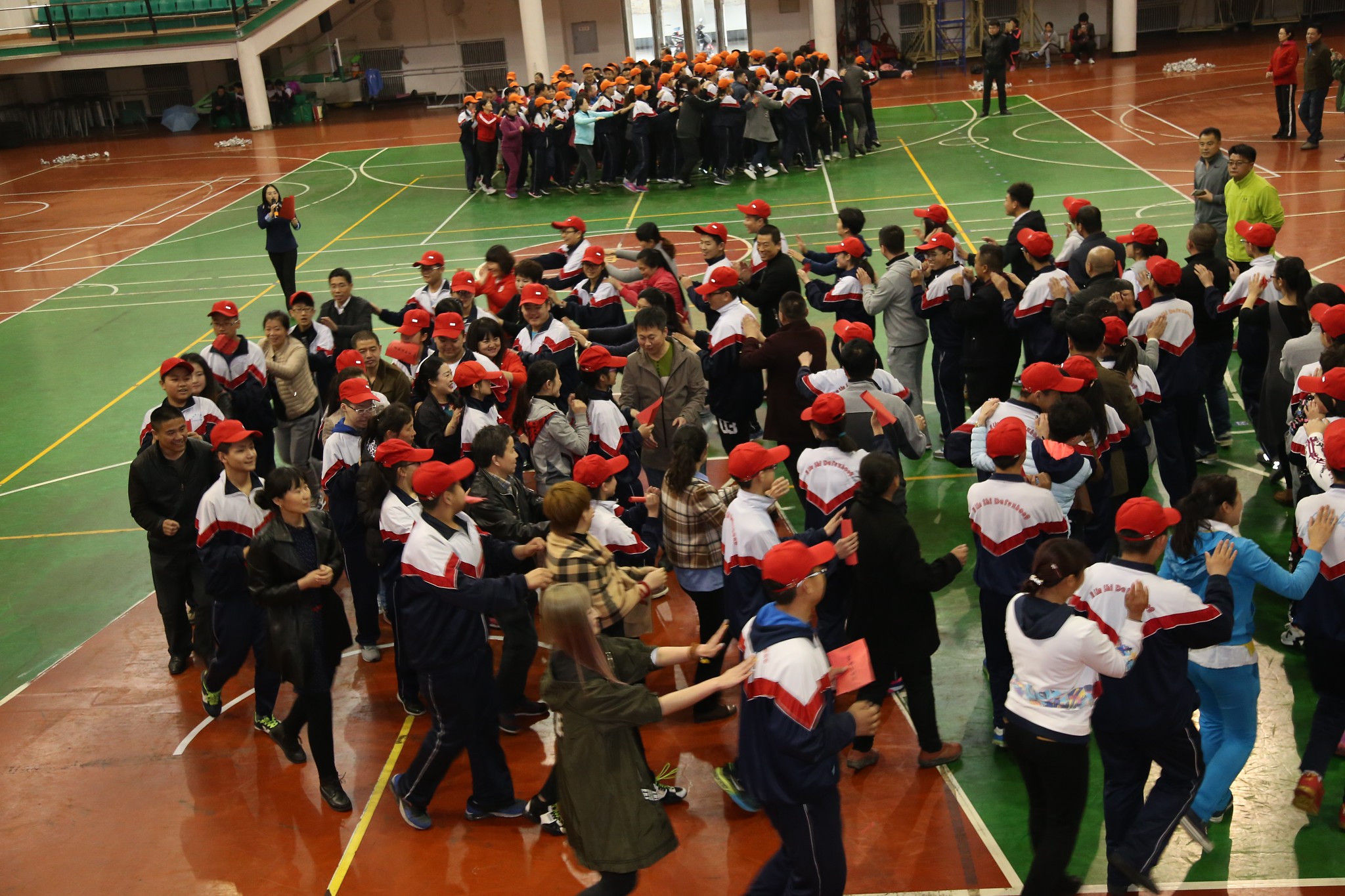 接下来是学生与父母在跑动过程中相互捶背的活动,速度由慢到快再到慢,力度由轻到重再到轻,一个简单的动作,一副单一的画面,却是那么幸福、那么温馨,会场气氛既活泼热烈,又轻快温暖。