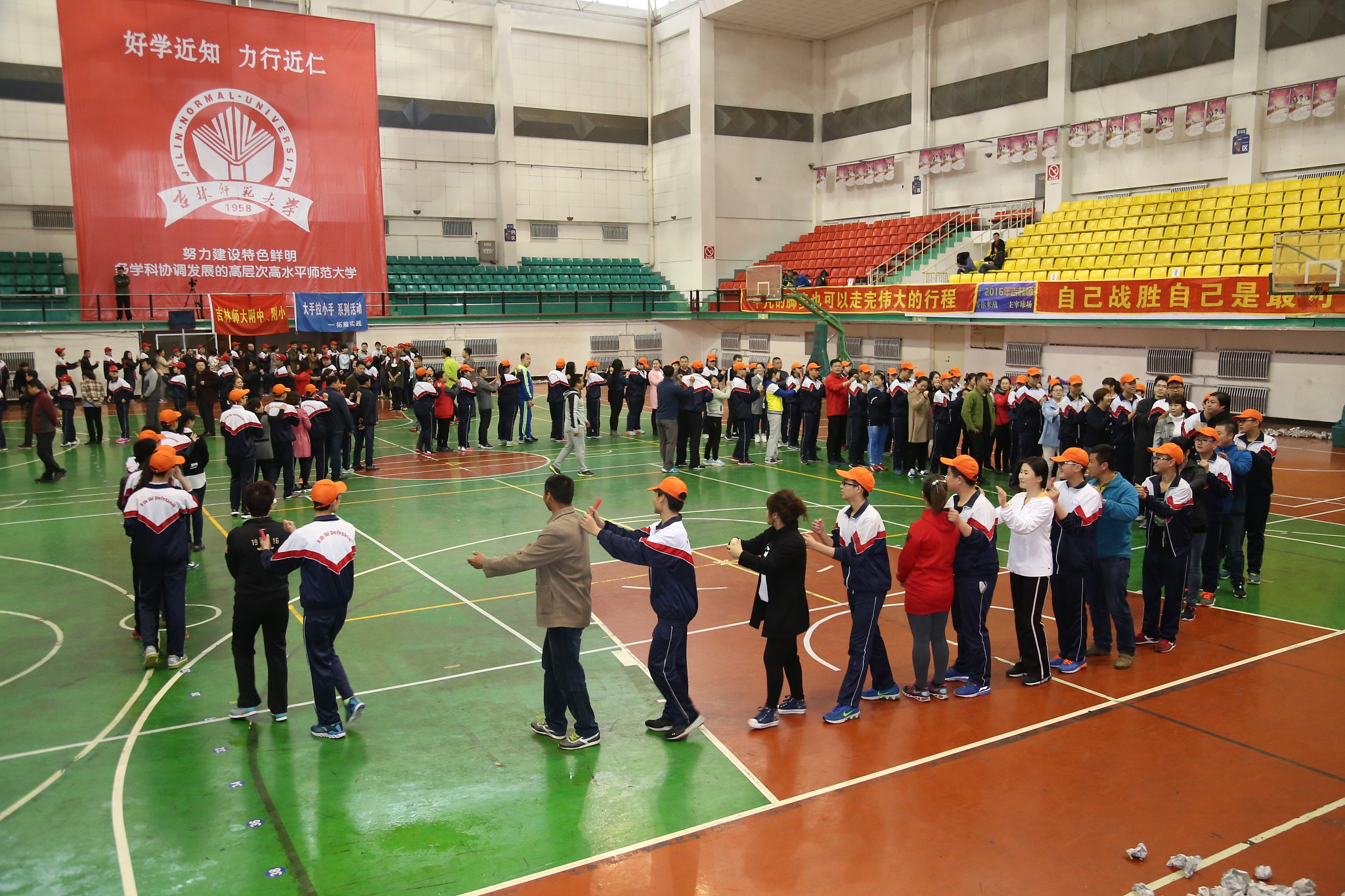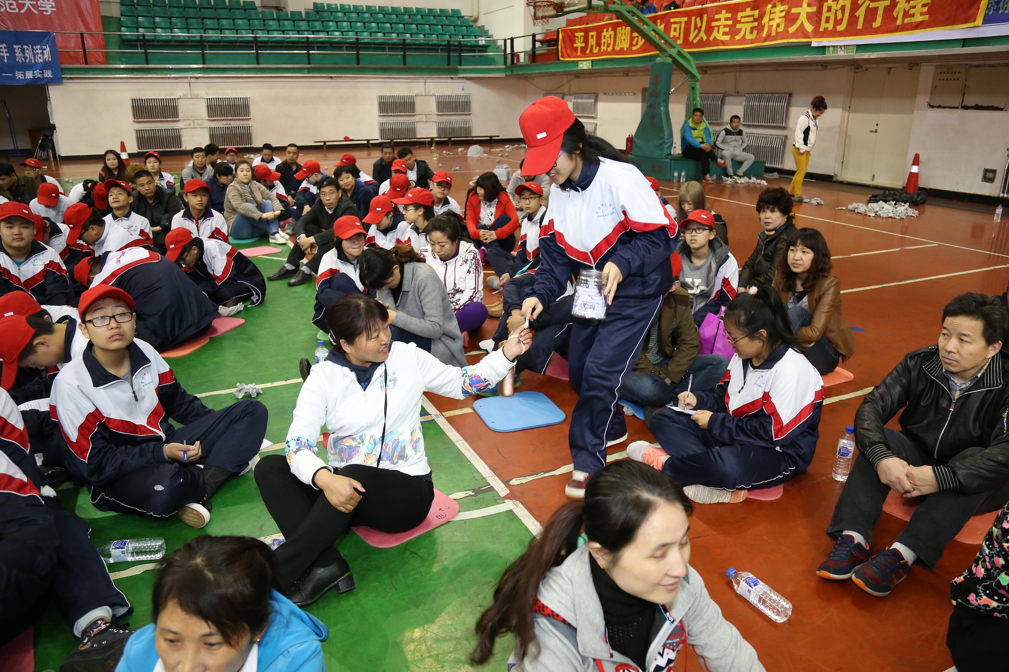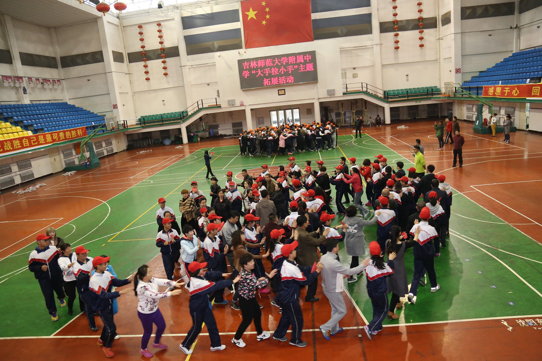 为了增进学生与父母之间的交流与理解,让学生学会感恩、合作与坚持,并能以阳光的心态直面中考挑战,4月17日上午8:30分,吉林师大附中科研处与政教处、心理咨询室等部门通力协作,举办了“大手拉小手”主题拓展实践活动。拓展活动邀请了九年级100名学生及100位学生家长共同参加,吉林师大附中附小校长李峰、副校长孙阳华,附中副校长闵红佳出席活动。活动全程由心理咨询室主任程金荣主持。
